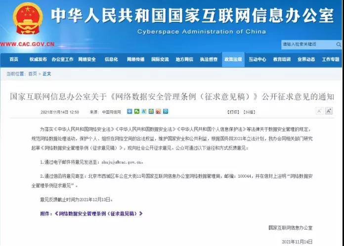 2021年11月14日,国家互联网信息办公室发布《网络数据安全管理条例(征求意见稿)》(以下简称《条例》),面向社会公开征求意见。《条例》旨在落实三大上位法关于数据安全管理的规定,规范网络数据处理活动,保护个人、组织在网络空间的合法权益,维护国家安全和公共利益。