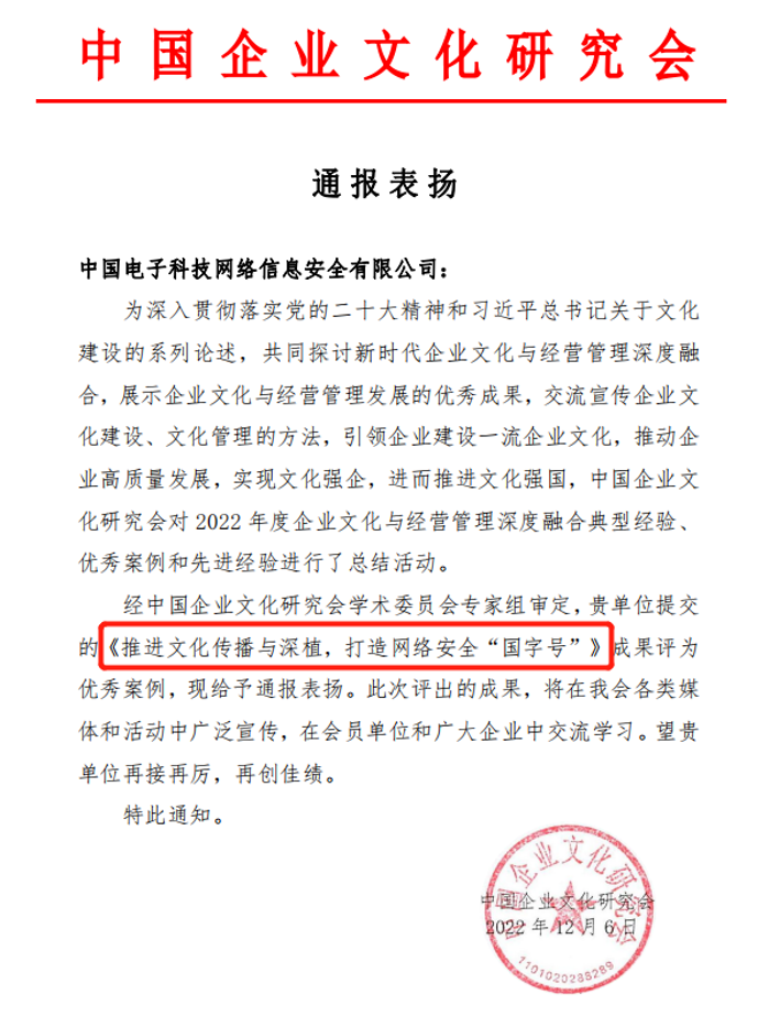 近日,中国企业文化研究会对2022年度企业文化与经营管理深度融合典型经验、优秀案例和先进经验进行了总结评选,中国网安《推进文化传播与深植,打造网络安全“国字号”》成果经中国企业文化研究会学术委员会专家组审定,获评为优秀案例。